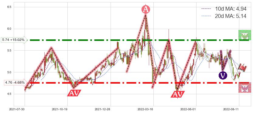 ♘ 阻力价格位5.74,可信任强度96.09%,距离最后交易2022-08-12形成的收盘价格4.99相差 +15.02%