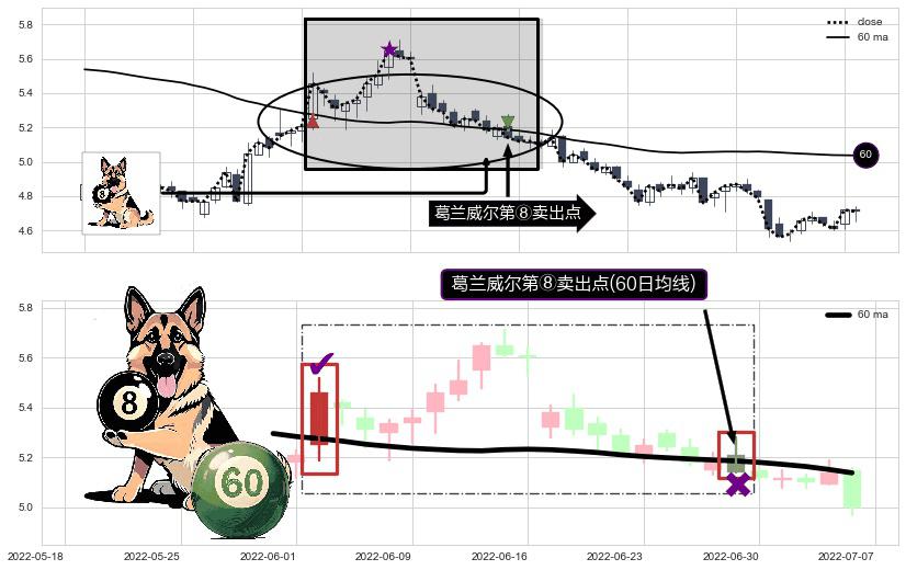 形态多维评估: ⚀ 2022-06-29-日显现 葛兰威尔均线 60日均线 第⑧卖出点 下降趋势的中继信号,后市看跌,卖出信号