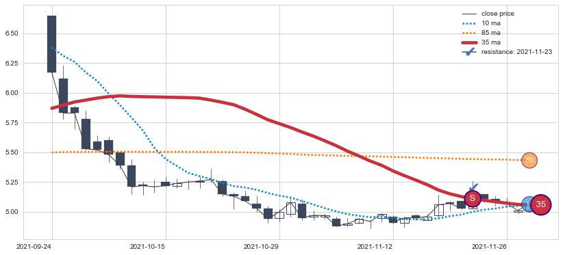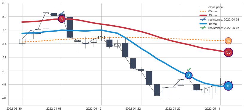 下跌趋势2022-03-30-2022-05-12,均线10, 35确认关键阻力2处