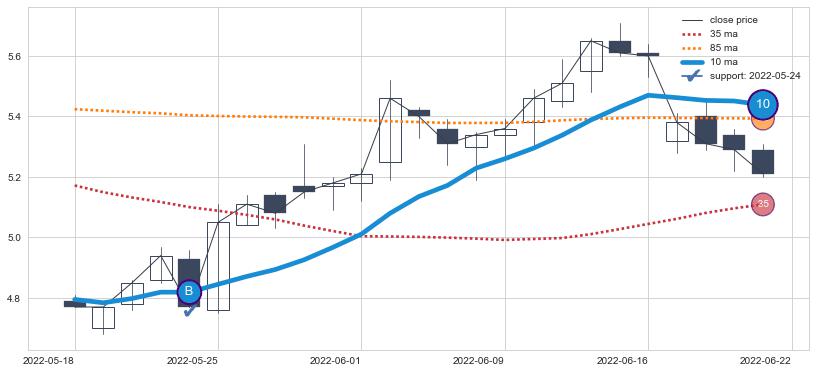 上涨趋势2022-05-18-2022-06-22,均线10确认关键支撑1处