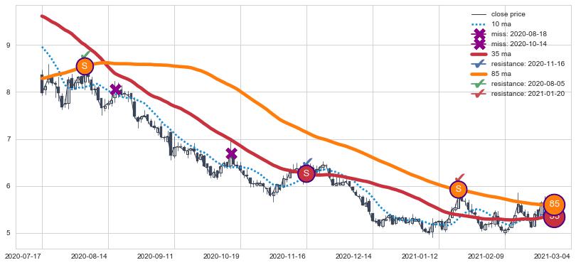 下跌趋势2020-07-17-2021-03-04,均线35, 85确认关键阻力3处