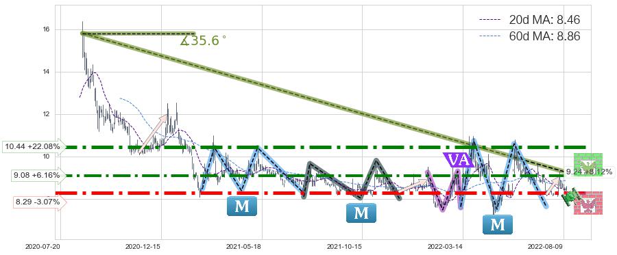 ♘ 阻力价格位9.08,可信任强度81.43%,距离最后交易2022-08-12形成的收盘价格8.55相差 +6.16%