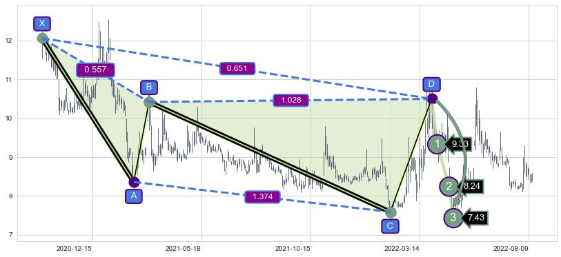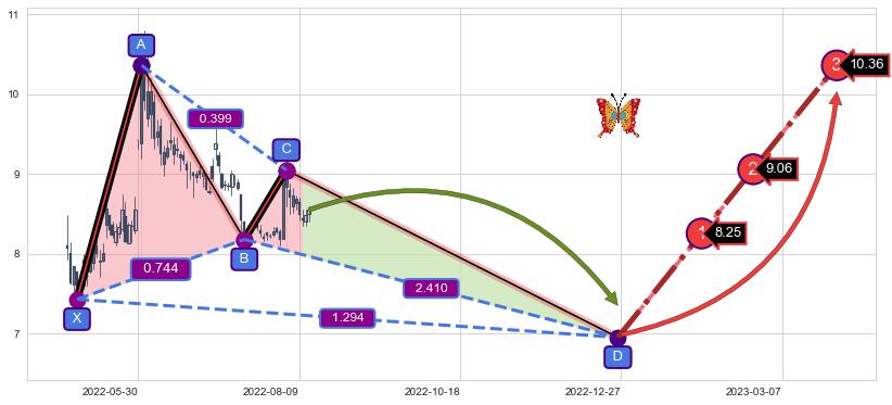➣ 未完成【蝴蝶】形态起点X: 2022-04-28, 已到达C点: 2022-08-03, 预测最终D点: 2022-12-26, 共167交易日