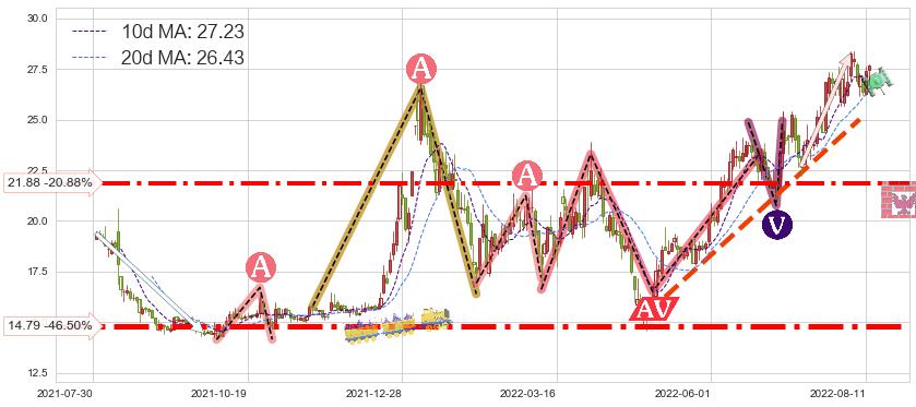 ♘ 支撑价格位21.88,可信任强度75.37%,距离最后交易2022-08-12形成的收盘价格27.65相差 -20.88%