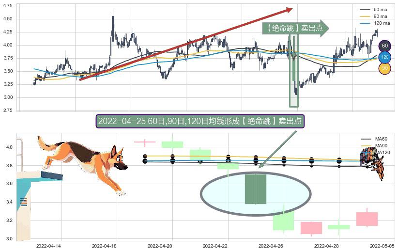 形态多维评估: ⚀ 2022-04-25日显现 60日-90日-120日均线 【绝命跳】卖出点 看空信号,后市看跌,卖出