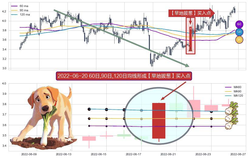 形态多维评估: ⚀ 2022-06-20日显现 60日-90日-120日均线 【旱地拔葱】买入点 看多信号,后市看涨,买入
