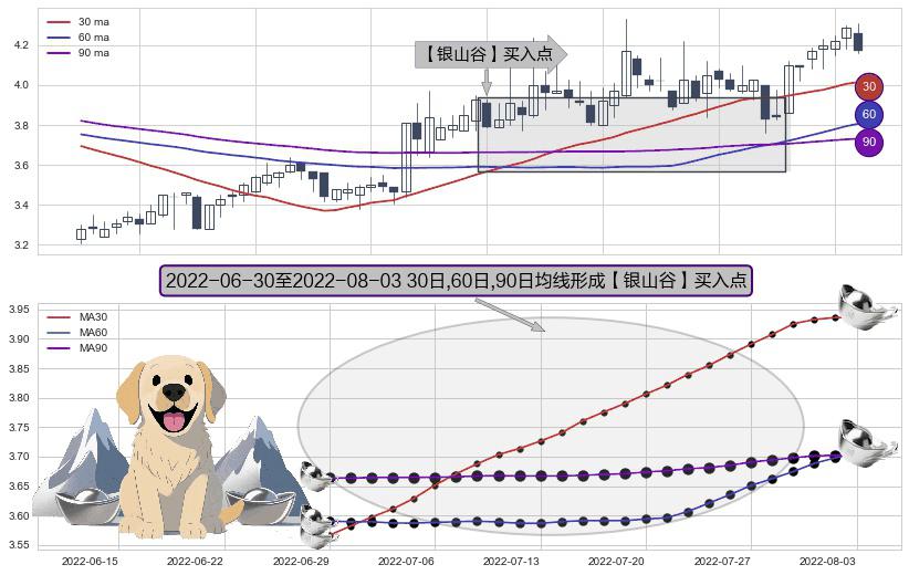 形态多维评估: ⚀ 2022-07-01-日至2022-08-03-日显现 30日-60日-90日均线 【银山谷】买入点 看多信号,后市看涨,买入
