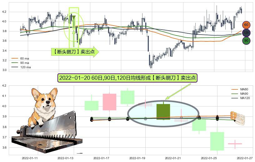 形态多维评估: ⚀ 2022-01-20日显现 60日-90日-120日均线 【断头铡刀】卖出点 看空信号,后市看跌,卖出