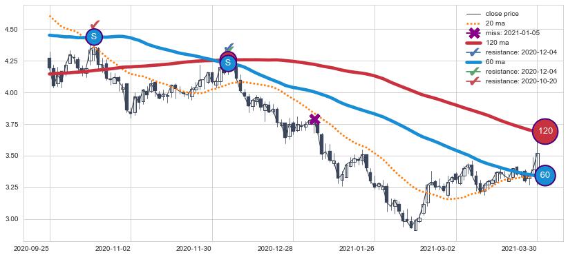 下跌趋势2020-09-25-2021-03-30,均线120, 60确认关键阻力2处
