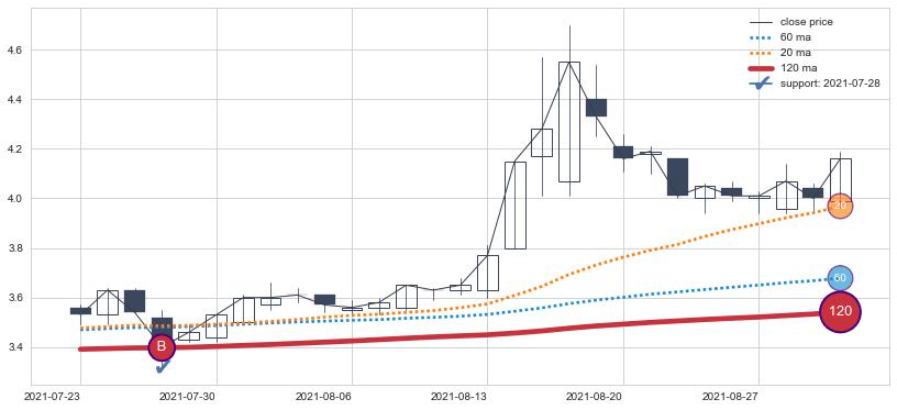 上涨趋势2021-07-23-2021-09-01,均线120确认关键支撑1处