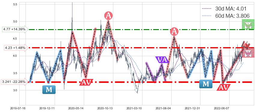 ♘ 阻力价格位4.77,可信任强度62.85%,距离最后交易2022-08-12形成的收盘价格4.17相差 +14.39%