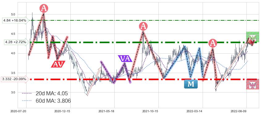 ♘ 阻力价格位4.84,可信任强度53.53%,距离最后交易2022-08-12形成的收盘价格4.17相差 +16.04%