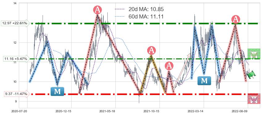 ♘ 阻力价格位11.16,可信任强度61.03%,距离最后交易2022-08-12形成的收盘价格10.58相差 +5.47%