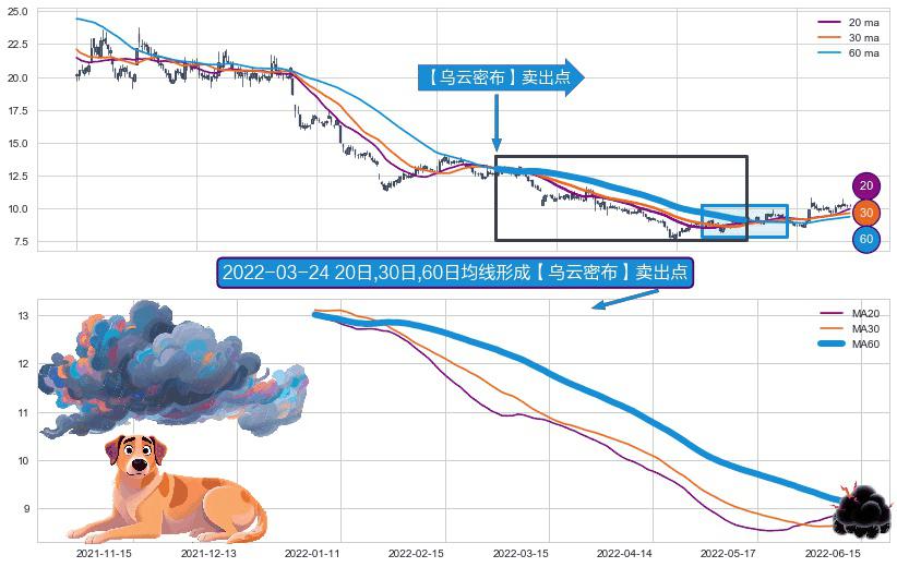 ⚀ 2022-01-04日-2022-06-13日显现 20日-30日-60日均线 【乌云密布】卖出点 看空信号,后市看跌,卖出