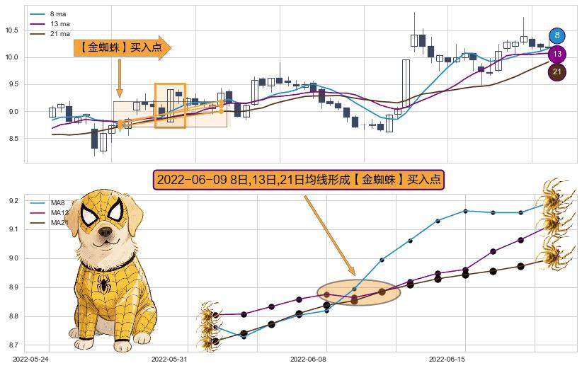 ⚀ 2022-06-09日显现 8日-13日-21日均线 【金蜘蛛】买入点 看多信号,后市看涨,买入