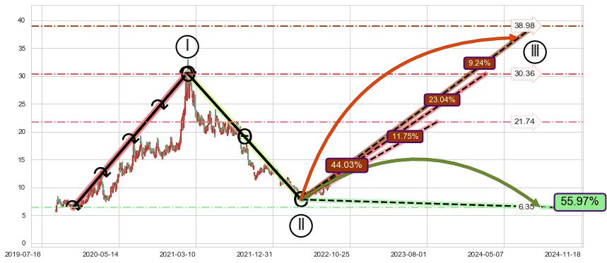 ➣ 调整浪已超过预测的c点位置,但后续大趋势循环浪高概率反转下跌,继续上涨概率44.03%,谨慎做多