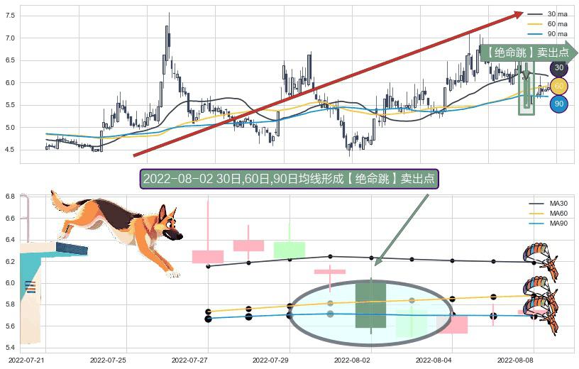 形态多维评估: ⚀ 2022-08-02日显现 30日-60日-90日均线 【绝命跳】卖出点 看空信号,后市看跌,卖出