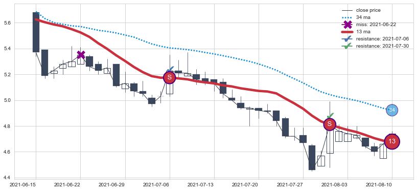 下跌趋势2021-06-15-2021-08-10,均线13确认关键阻力2处