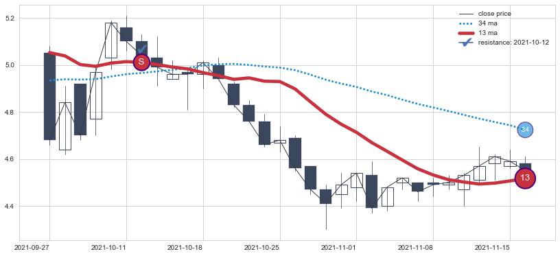 下跌趋势2021-09-27-2021-11-16,均线13确认关键阻力1处