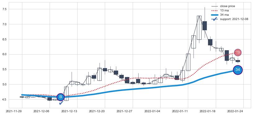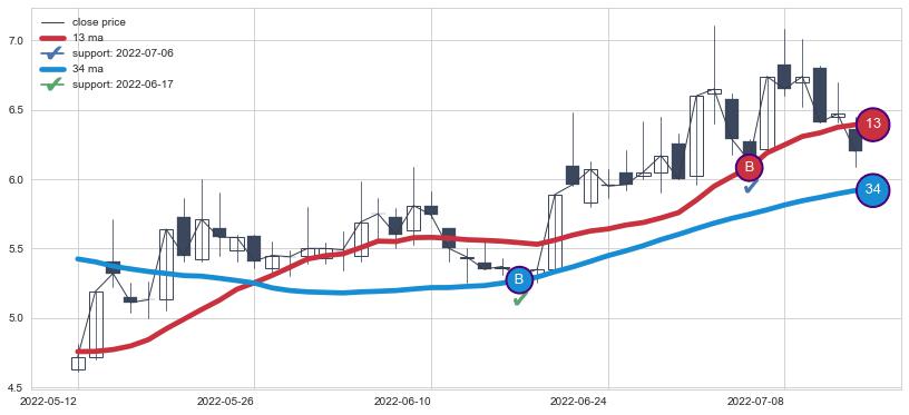 上涨趋势2022-05-12-2022-07-14,均线34, 13确认关键支撑2处