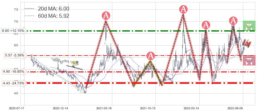♘ 阻力价格位6.60,可信任强度73.81%,距离最后交易2022-08-12形成的收盘价格5.89相差 +12.10%