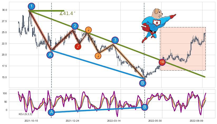 ⚔️ 2021-09-23-2022-05-25下跌趋势存在反转上涨[机会],其原下跌趋势的阻力位(15.05)已被突破[强支撑信号],原下跌趋势角度: 41.4˚