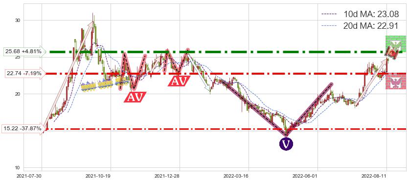 ♘ 阻力价格位25.68,可信任强度91.40%,距离最后交易2022-08-12形成的收盘价格24.50相差 +4.81%