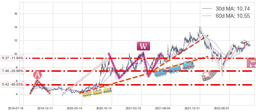 ♘ 支撑价格位7.46,可信任强度90.19%,距离最后交易2022-08-12形成的收盘价格10.63相差 -29.86%
