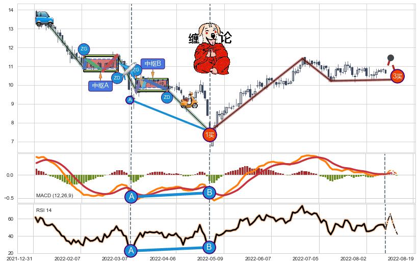 ➣ 【中枢B】:2022-03-10-2022-03-29,中枢由5笔构成,共14交易日, ZG=10.27, ZD=9.86