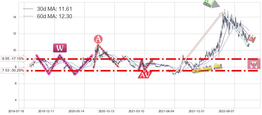 ♘ 支撑价格位8.95,可信任强度91.07%,距离最后交易2022-08-12形成的收盘价格10.80相差 -17.15%