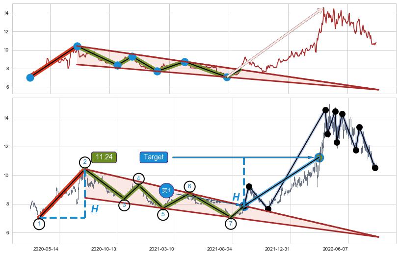 ➢ 最小中继整理涨幅→𝐇: 3.380 (𝐇楔型旗杆的长度:楔型起点→顶点)