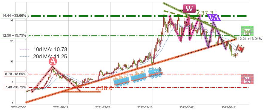 ♘ 阻力价格位12.50,可信任强度58.24%,距离最后交易2022-08-12形成的收盘价格10.80相差 +15.75%
