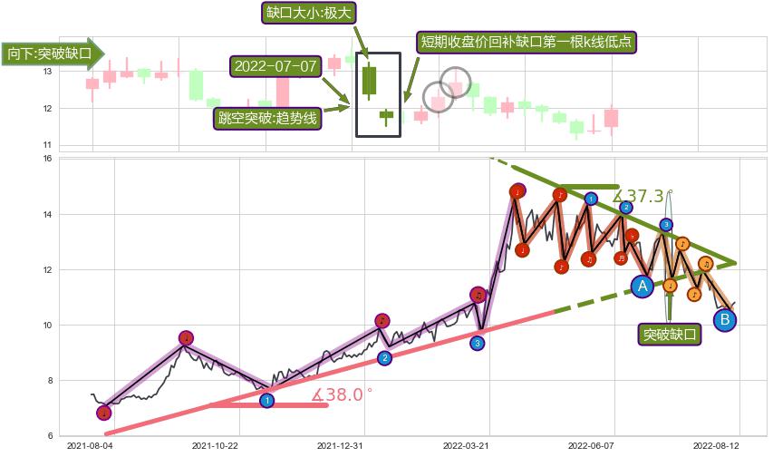 ✂️ 2021-07-30-2022-04-28上升趋势存在反转[风险],其原上升趋势的支撑位(12.23)已破位[强阻力信号],原上升趋势角度: 38.0˚