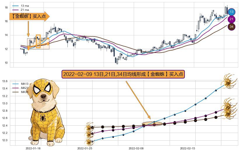 ⚀ 2022-02-09日显现 13日-21日-34日均线 【金蜘蛛】买入点 看多信号,后市看涨,买入