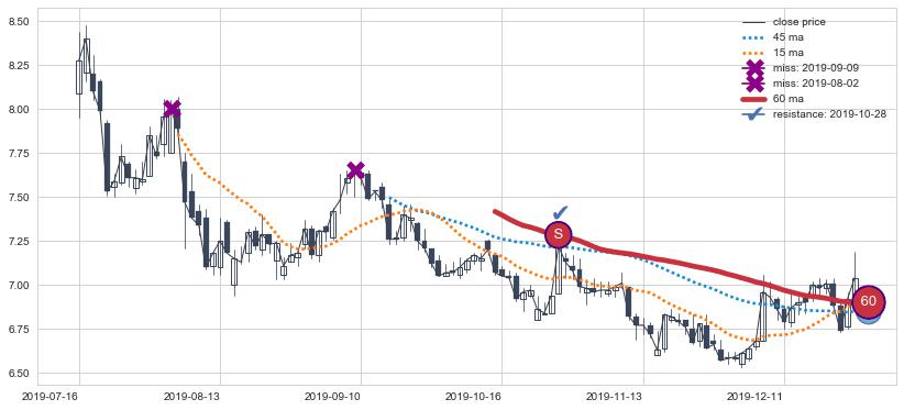 ➢ 最优均线组合共正确确认支撑阻力信号11处,正确确认率 64.71%