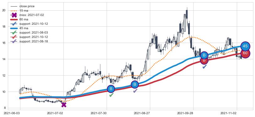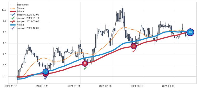 ⚁ MA3和MA8走势平行,且始终保持在短距离内,MA21始终在短中期均线下方,与短中期均线保持一定的距离,微微上行
