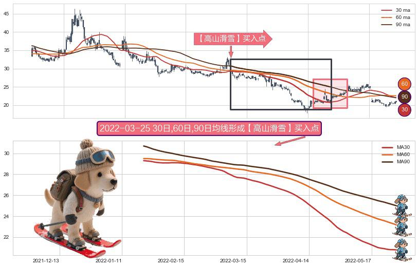 ⚀ 2022-01-20日-2022-05-27日显现 30日-60日-90日均线 【高山滑雪】买入点 看多信号,后市看涨,买入
