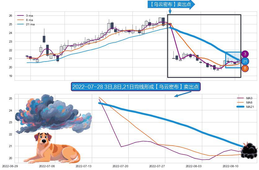 ⚀ 2022-07-14日-2022-08-11日显现 3日-8日-21日均线 【乌云密布】卖出点 看空信号,后市看跌,卖出