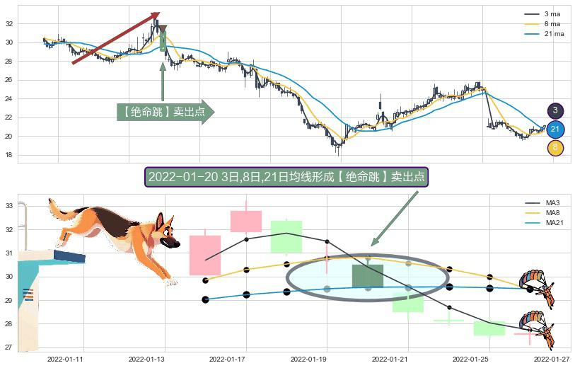 ⚀ 2022-01-20日显现 3日-8日-21日均线 【绝命跳】卖出点 看空信号,后市看跌,卖出