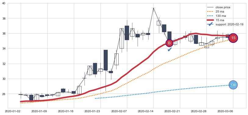 ⚁ MA5和MA10走势平行,且始终保持在短距离内,MA20始终在短中期均线下方,与短中期均线保持一定的距离,微微上行