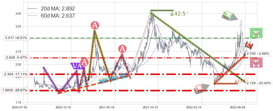 ♘ 阻力价格位3.017,可信任强度52.07%,距离最后交易2022-08-12形成的收盘价格2.780相差 +8.51%