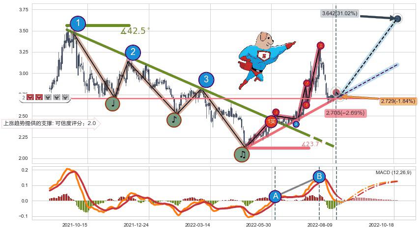 ♘ 在最后的上升阶段2022-04-26至2022-08-11存在 持续未破位的支撑位 ,支撑价格2.705,支撑可信任强度64.72%,其距离最后价格2.780相差 -2.69%