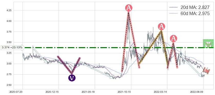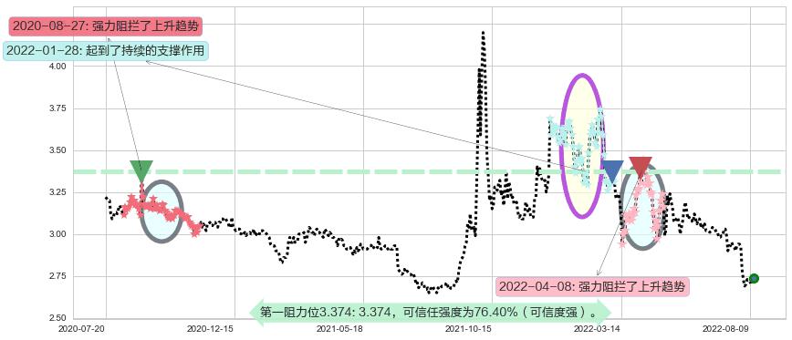 ♘ 阻力价格位3.374,可信任强度76.40%,距离最后交易2022-08-12形成的收盘价格2.740相差 +23.13%