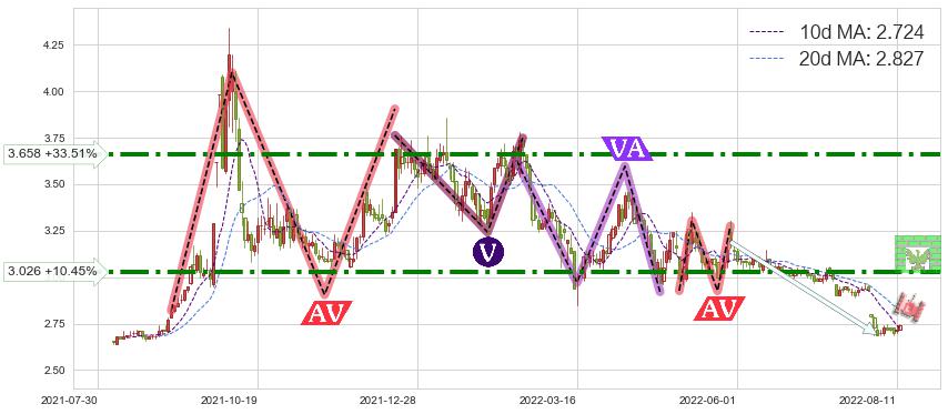 ♘ 阻力价格位3.026,可信任强度81.64%,距离最后交易2022-08-12形成的收盘价格2.740相差 +10.45%