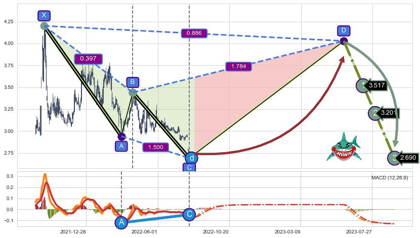 ➣ D点拟合预测价格4.03,距离最后交易收盘价格2.740相差 +47.00%