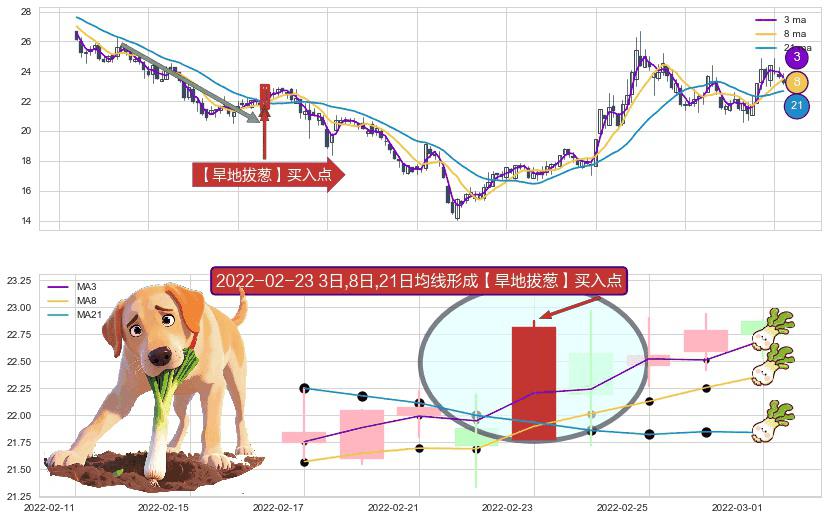形态多维评估: ⚀ 2022-02-23日显现 3日-8日-21日均线 【旱地拔葱】买入点 看多信号,后市看涨,买入