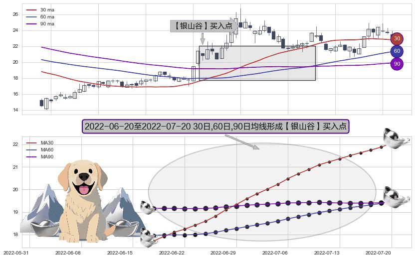 形态多维评估: ⚀ 2022-06-21-日至2022-07-20-日显现 30日-60日-90日均线 【银山谷】买入点 看多信号,后市看涨,买入