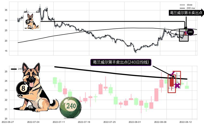形态多维评估: ⚀ 2022-08-10-日显现 葛兰威尔均线 240日均线 第⑧卖出点 下降趋势的中继信号,后市看跌,卖出信号
