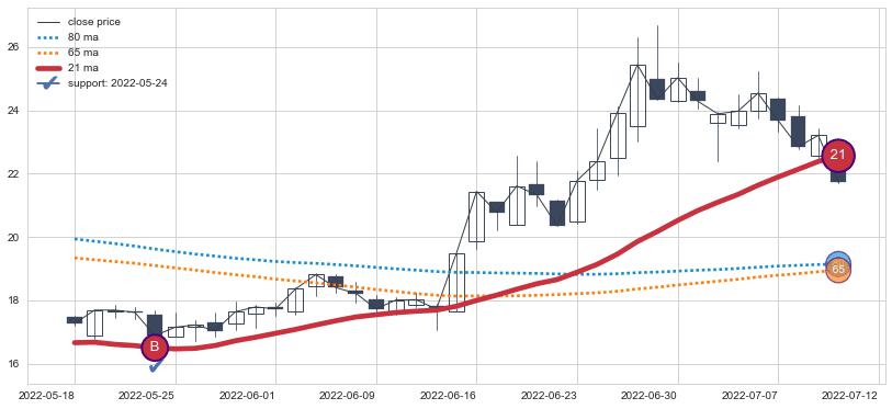 上涨趋势2022-05-18-2022-07-12,均线21确认关键支撑1处