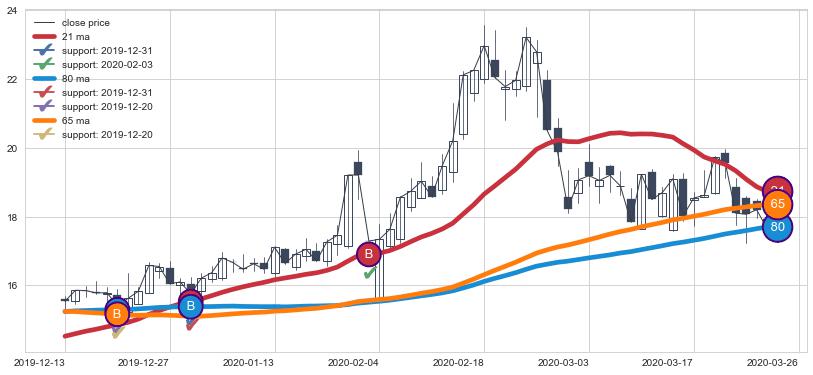 上涨趋势2019-12-13-2020-03-26,均线80, 65, 21确认关键支撑3处